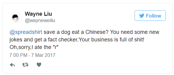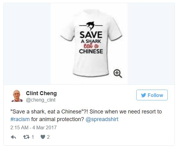 尽管这两款衬衫并不是由Spreadshirt设计,但很多网友依然炸了:环保就环保,你扯上中国人干嘛??中国人这么多,肯定每个人都吃鱼翅吗??