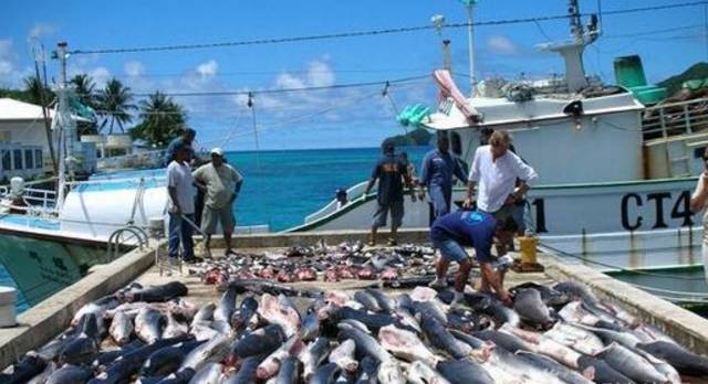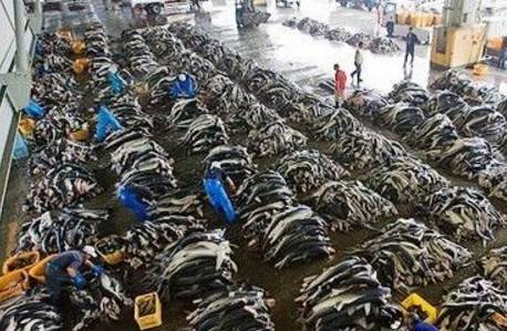 鳍被割下后,鲨鱼的尸体被堆起来,等待出售
