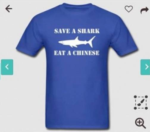 这是来自德国服装订制网站Spreadshirt的设计师设计的一件衬衫,当时,有网友发现衬衫上面大字写着“Save A Shark,Eat A Chinese”(救一条鲨鱼,吃一个中国人)...