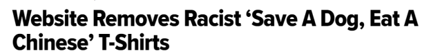 除了鲨鱼的版本,还有另外的狗狗版本,“Save A dog,Eat A Chinese”(救一只狗,吃一个中国人)