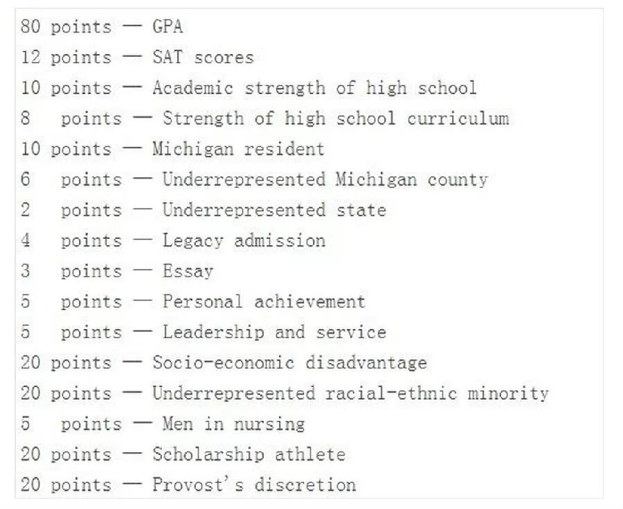 在辩论平权法案涉及逆向歧视白人的安娜堡密西根大学的上诉案时,美国最高法院于2003年废除了密西根用点数给予少数族裔优惠的录取政策。因为申请州立大学的人数众多,州立大学远没有私立学校那样雄厚的财力去雇用足够的评审官员,这样导致很多州立大学以硬性指标而不是通过细读每个学生的申请材料来做录取决定。密西根当时实施的是一个150点数的录取评价系统,达到100点的学生将会被自动录取(详细情况见图一)。GPA最高的4.0使学生得到80点,GPA 3.0的学生的点数则降为60; SAT满分1600为12点,随SAT成绩的降低学生的点数将从12点递减。密西根校友子弟额外加4点,而作文则仅为3点,大家从此也能看出公立和私立大学录取学生的差别,因为这些对于常春藤的申请十分重要的环节,在著名的旗舰类州立大学都几乎可以忽略不计。但是只要你是属于非洲裔,拉丁裔或印第安裔等少数族裔,你除了像其他族裔的学生得到相应的点数外,你还能自动得到20点的附加值。这个红利有多大呢? 它相当于学生将满分为4.0的GPA提升了整整1.0。优异的白人或亚裔考了当时的SAT满分1600,其在录取中的份量仅相当于少数族裔选项的百分之六十!