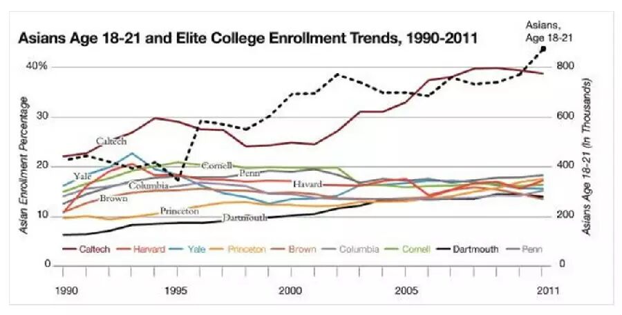 让我们从此统计图更进一步地理解亚裔入学常春藤所遇到的政策性歧视。此图的右侧纵坐标为美国亚裔适合读大学的学龄人口(18-21岁),左侧纵坐标为亚裔在校园内的百分比,横坐标为1990年至2011年大约二十年的时间段。这二十年里,亚裔学龄人口从1990年的大约40万增加到2011年的大约80万。正如科学研究中的阳性对照,作为完全没有限制而凭本事入学的大学的代表,加州理工学院的亚裔从1990年的20%左右增加到2011年的40%左右,这是没有配额的情况。