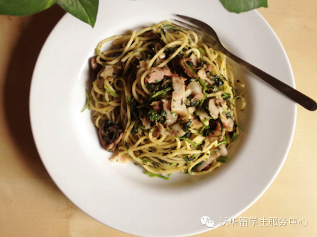 另一种算不上中式做法,却依然符合中式口味的方法是使用罗勒制成的青酱拌意面。意大利面是留学生懒人厨房必备,原料简单,制作方便。