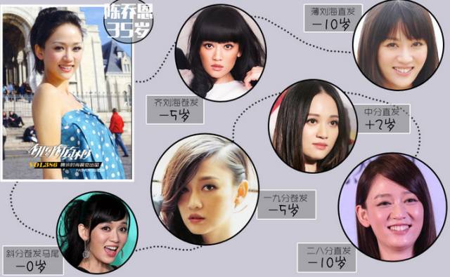 陈乔恩:号称 " 电视剧女王 " 的陈乔恩在电视剧里永远一副纯天然无公害的样子,可在戏外,已经三十五岁的她也要认清现实了。微卷的斜刘海卷发、萌妹专属的齐刘海卷发放在她身上都有点那么不和谐了。