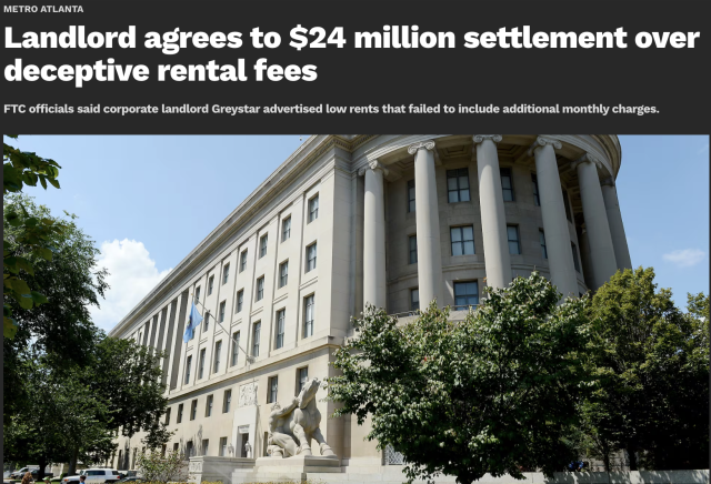 最近,美国最大的公寓管理公司之一 Greystar 被联邦贸易委员会(FTC)点名,并同意支付 2400 万美元和解金。原因只有一个,它们长期用低租金吸引租客,却把大量强制性收费藏在合同深处。