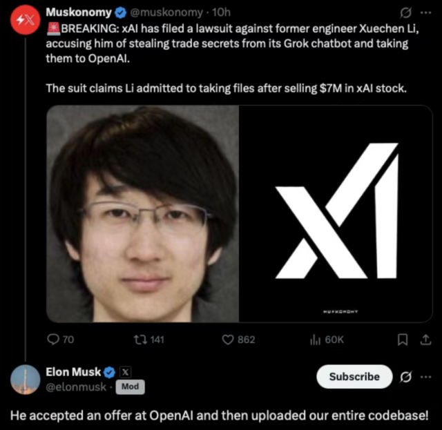 埃隆·马斯克的xAI在加州联邦法院起诉前华裔工程师Xuechen Li,指控其窃取Grok聊天机器人机密并跳槽至OpenAI。