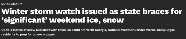 不过,从更长的气候趋势来看,佐治亚州出现一次或两次明显的冰雪周末仍属不太常见但并非异常——过去的冬季也曾出现过类似事件(比如 2015 年和 2017 年把雪或冰推送到本州与邻近地区的系统)。这些事件往往导致交通混乱、停电和应急响应升级,但不会像北方那样长期影响日常生活。