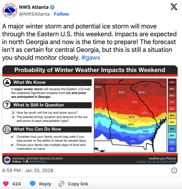 在佐治亚,这样的一次冬季风暴提醒我们:南方的“冬天”虽不常停留太久,但一旦到来,足以改变短期的日常生活节奏。提前准备、关注气象更新,是每个家庭这个周末可以做的最好事情。