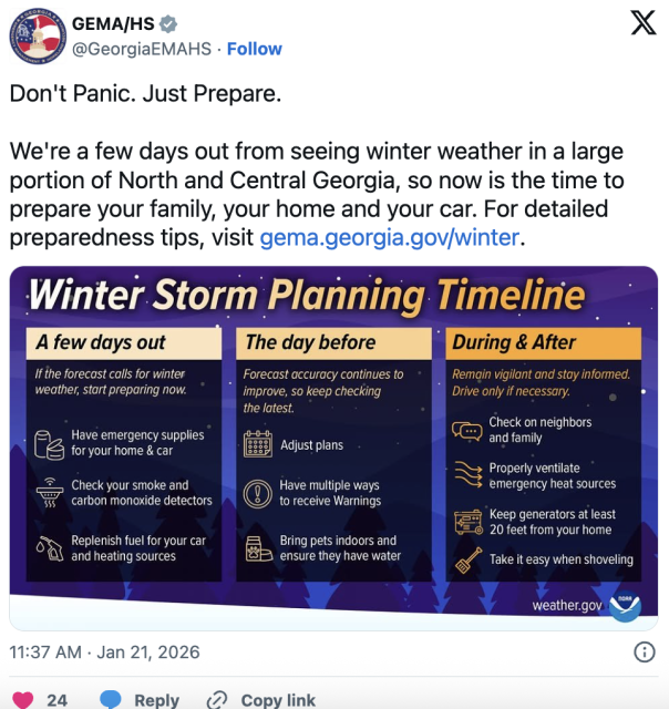 州长 Brian Kemp 和应急机构已多次发声,提醒公众提前做好准备——包括准备食品、水、燃油,以及可能应对停电的方案。专家强调:不要惊慌,但要准备周全。