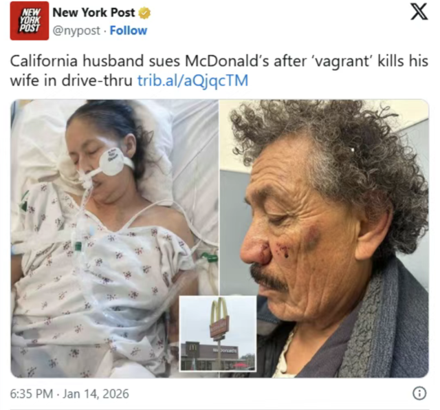 加州男子Jose Juan Rangel近日向洛杉矶高等法院起诉麦当劳及其两家特许经营商,指控其58岁妻子Maria Vargas Luna在博伊尔高地麦当劳Drive-Thru被流浪汉袭击致死,而店员全程目睹却未报警或施救。