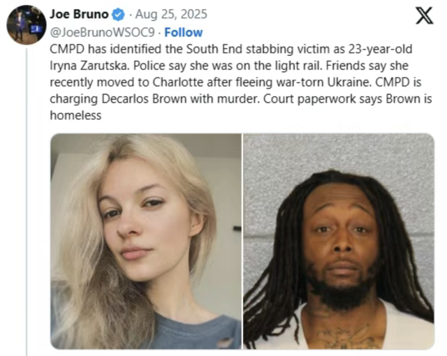 23岁乌克兰女子伊琳娜·扎鲁茨卡(Iryna Zarutska)在北卡罗来纳州夏洛特市南区轻轨站被发现身亡,身上多处刀伤。她逃离乌克兰战火,寻求在美国开启新生活,却惨遭34岁无家可归者德卡洛斯·布朗(Decarlos Brown Jr.)杀害。