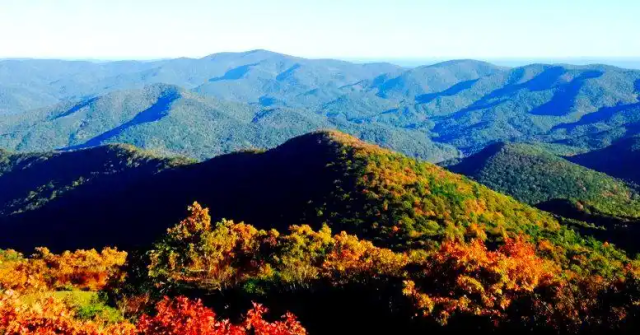 这里海拔超过3600英尺,沿途停车点与山顶步道可将层层叠叠的林海尽收眼底。十月期间,森林由翠绿渐变为琥珀与绯红,远方的Blue Ridge山脊线条柔美朦胧,而山谷间则迸发出浓墨重彩的秋意。