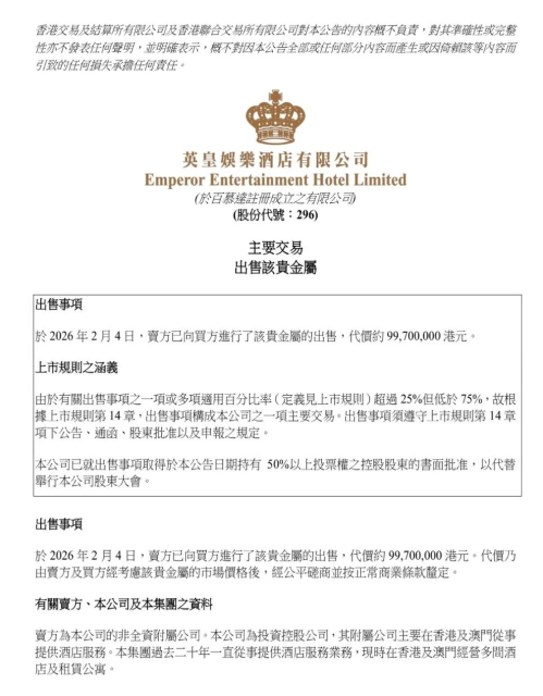 2月4日,英皇娱乐酒店有限公司发布公告,表示已经将这些金砖出售,金额约9970万港元,扣掉购入时花费的940万,以及交易成本约10万港元,净收益高达9,020万港元。