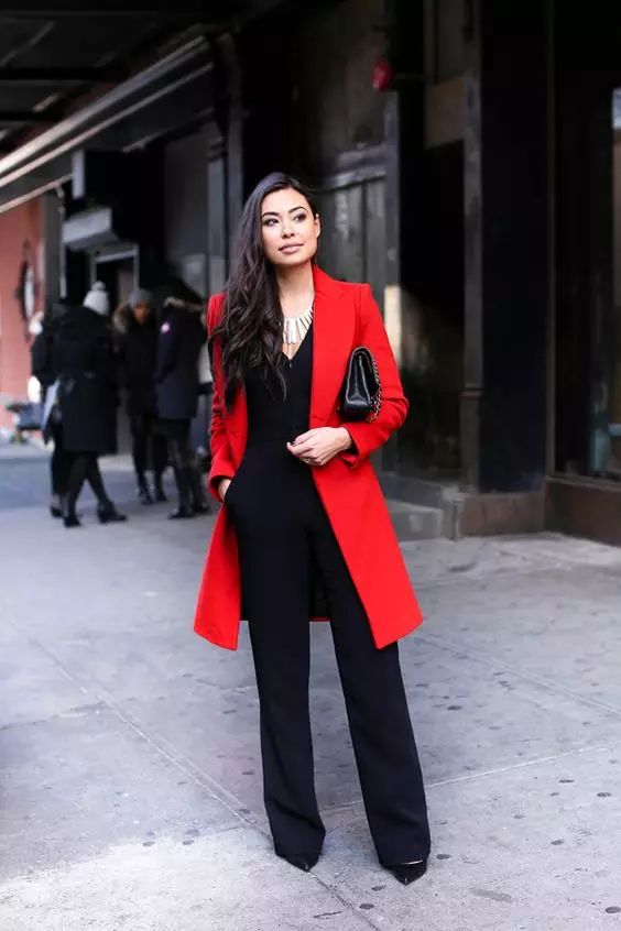 利落剪裁的红大衣+黑色套装+项链,年会场合你最美!