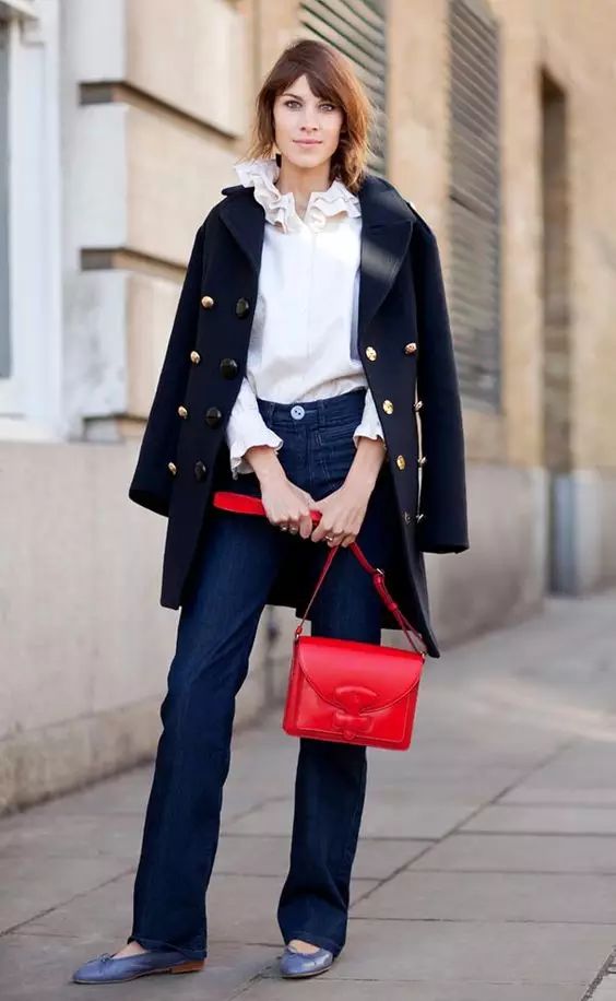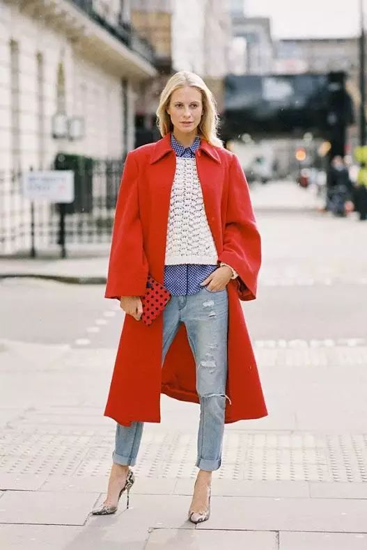 红色外套很百搭,配上仔裤球鞋或是高跟都各有各的风格,红蓝白三色再经典不过了。