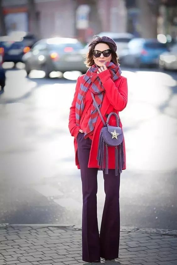 红紫色条纹围巾别致优雅,搭配红色大衣刚刚好。