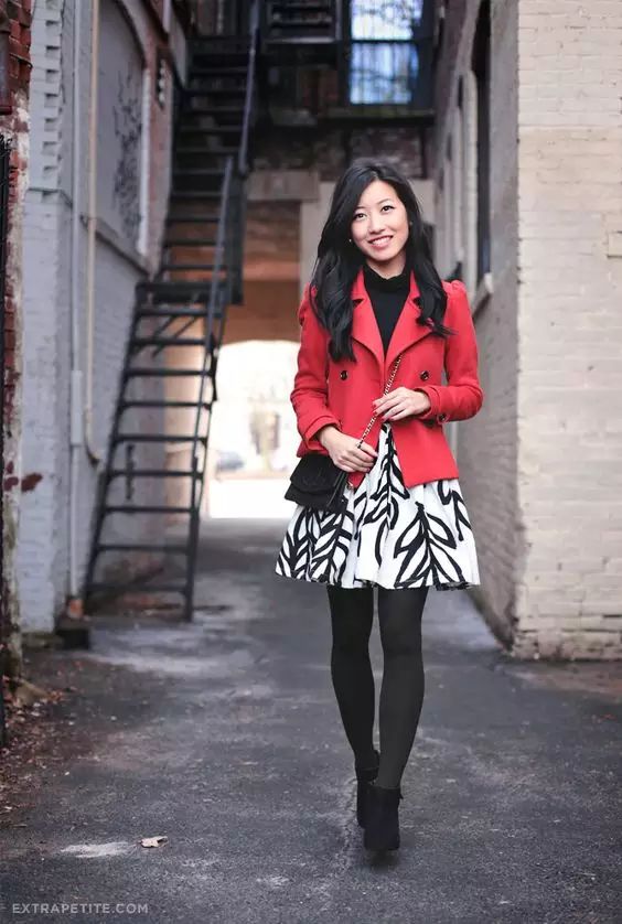 娇小女生穿剪裁合身的短款红大衣+A字裙,立马拥有好比例~