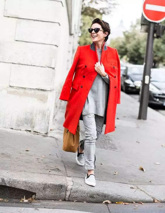 灰毛衣+灰牛仔裤让高饱和度大衣更显质感。