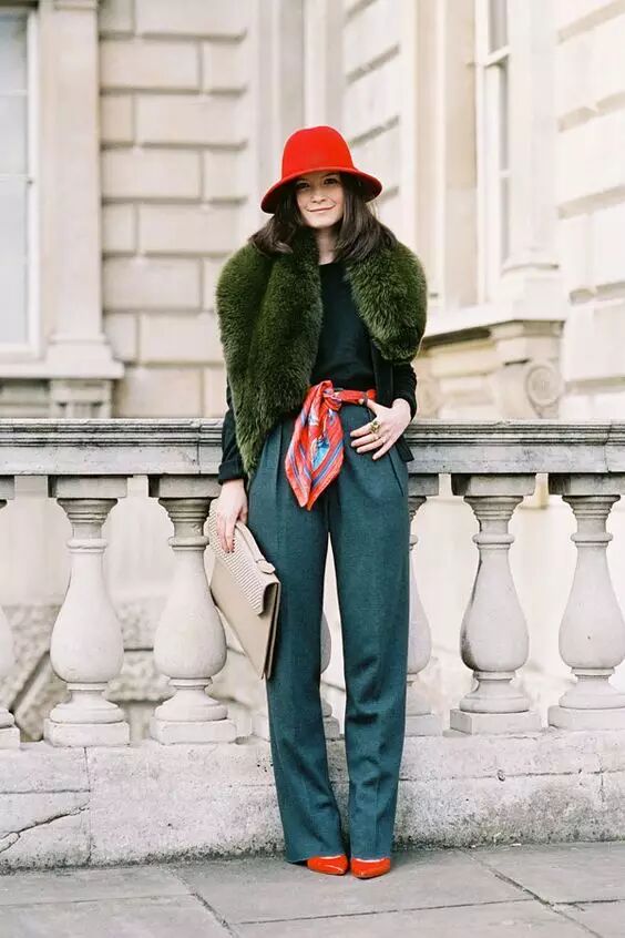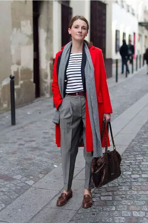 红大衣+西装裤+乐福鞋,避免俗气就靠增添复古风。
