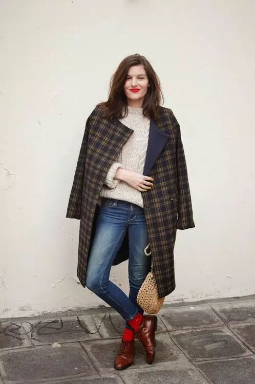 红袜子+红皮鞋+格纹大衣,复古小时髦。配红唇更韵味。