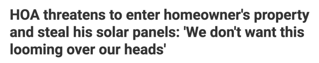 问题在于,很多 HOA 并没有专门针对太阳能的条款,而是用一条泛泛而谈的外部改动需审批,来无限放大解释权。