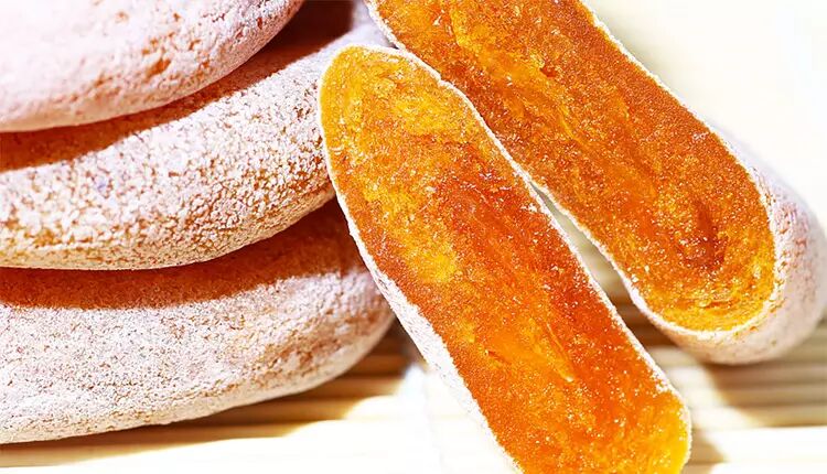 柿饼是将柿子去皮,在阳光下自然风干晾制而成。其中,“富平尖柿”制成的柿饼质量最优,畅销国内外。柿子加工成柿饼后,维生素A含量也由20微克增加到48微克。
