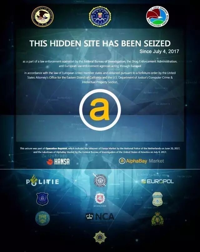 2017年7月,由美国联邦调查局、美国缉毒局与荷兰国家警察总局主导,英国、加拿大、法国、德国、立陶宛、泰国以及欧洲刑警组织协助,采取联合行动,关闭了全球最大暗网平台“AlphaBay”(阿尔法湾)。