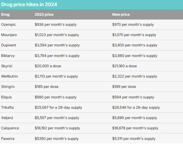 - 平均涨幅15%,折合每种药品涨价590美元,最高涨幅达到3000%。
