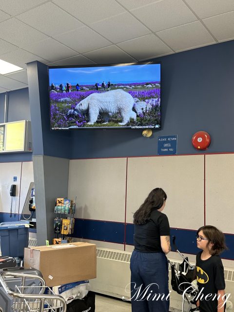 直至登机口,才得知航班延误一小时。工作人员送上登机牌与20加元餐券作为补偿。早有耳闻丘吉尔物资稀缺,我们便以券换了些巧克力和牛肉干随身携带。