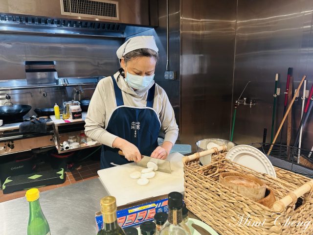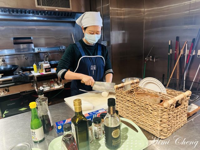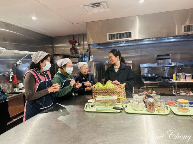 Sharleen 老師帶著我們把大白菜的菜梗與菜葉分開。菜梗切塊,