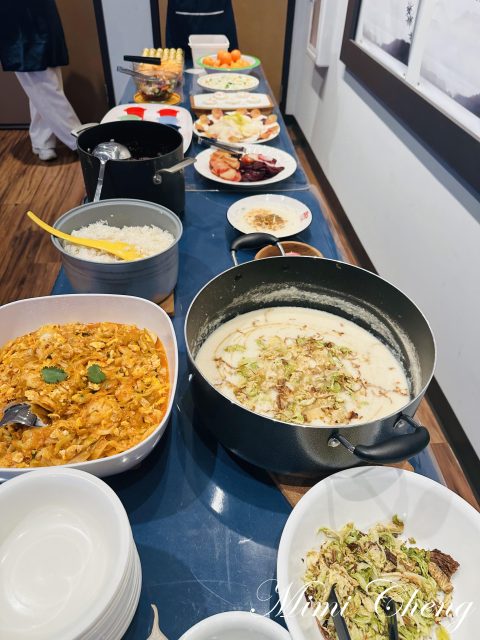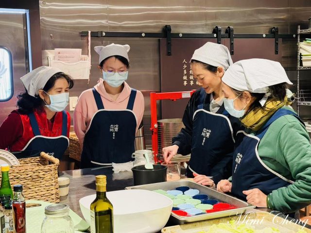 屋內,桌面被鋪陳得整齊而素雅。雅捷老師和 Sharleen 老師正把各種食材一一擺上長桌,白蘿蔔的清透、甜菜根的深紅、