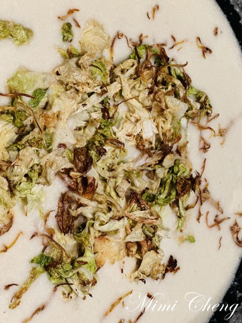 二十分鐘後,用小美機打成濃湯。白菜葉則被送進烤箱,烤至微乾,