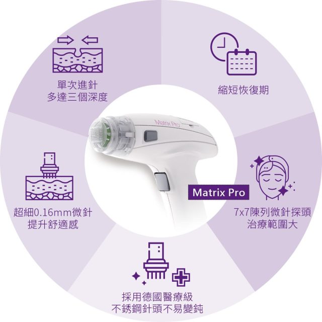 Matrix Pro 结合射频、微针与激光三重能量,从肌肤深层激活修复机制,打造紧致光滑美肌。