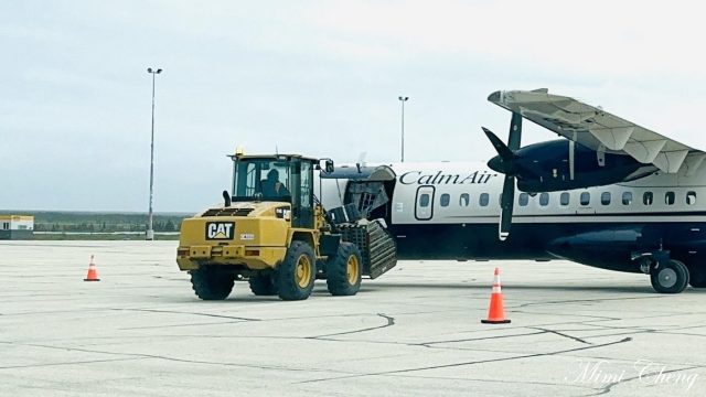 我和小宁坐在窗边,看行李用铲车送来,好奇特。