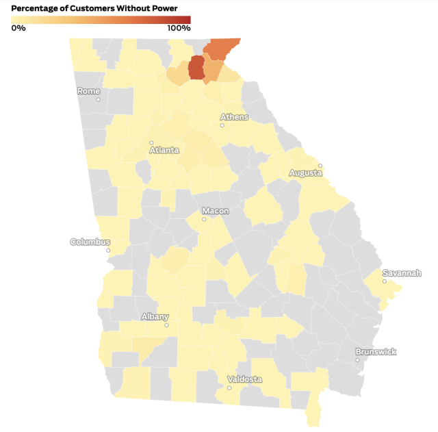 这场风暴亚特兰大市区、Gainesville、Athens、Lawrenceville、Roswell、Peachtree Corners一路到东北佐治亚山区,都在冰灾核心区。