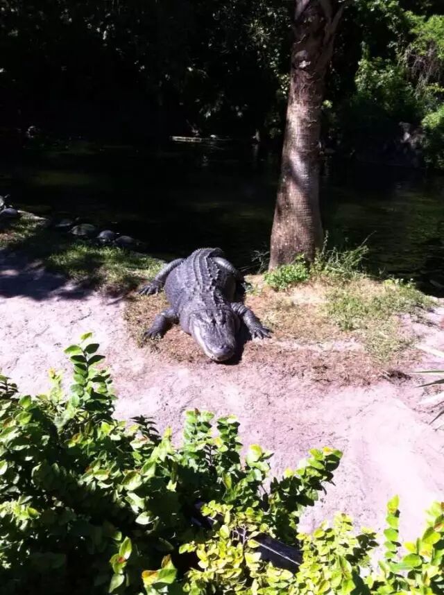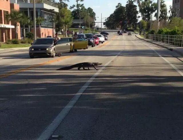鳄鱼君相当高冷,即使身边围满了一群没有见识、大呼小叫、不停拍照的 无知人类,它们也顶多不过是抬抬眼皮、动动尾巴,身体挪都懒得挪。但这并不意味着它们没有攻击性,如果你靠得太近令它们感到威胁,后果请自行脑补。还有,虽然鳄鱼宝宝萌萌哒,但是在佛罗里达,擅自喂养鳄鱼可是违法的行为——你并不可以把它当作宠物。有句话怎么说来着?“流氓会武术,谁也挡不住。”虽然鳄鱼君并不流氓,但是那一嘴锋利的大牙,让人看了就腿软。因为校园里有一个 Alice湖,所以……“ 鳄鱼出没请注意! ”鳄鱼过街是怎样的情景呢?
