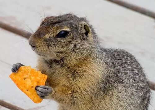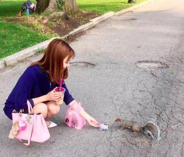 不过需要注意的是,请谨慎抱养野生浣熊,因为它们很可能携带一些细菌病毒。另外,在饲养浣熊的过程中,尽量不要打它。浣熊是个爆脾气,当它不爽时便会放出大招——咬人!最会卖萌比起浣熊兄弟花大工夫在垃圾箱里挑挑拣拣,松鼠获得食物的方式却轻松很多。原因只有一个,它们很会卖萌呀!在来美国之前,我以为这里的松鼠会像天朝的一样怕人,人一靠近它便会一溜烟地逃走。后来我才发现,这里的松鼠一点也不怕人(尤其是校园里的),看到你在吃东西,它就嗖一下窜到你面前,瞪着小圆眼睛,露着两颗大门牙,充满期待地望着你。你掏出一片薯片放到它面前,它拿了薯片,也不会继续烦你,与你保持着一个安全距离,专注地吃起来。
