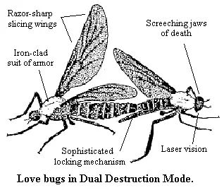 这是有名的 love bugs,主要生活在美国南部地区。它们成双成对的一起飞,喜欢落在颜色鲜艳的车体表面。为了大家阅读心情,我就不上实物图了。
