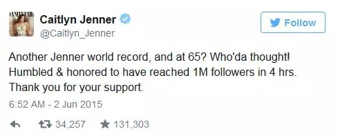 很快,头条就被Caitlyn承包了!10条娱乐新闻8条都跟她有关!而她也创造了新纪录——推特粉丝最快达到100万!用时仅4个小时!完秒之前的最快纪录——小罗伯特·唐尼用时23小时22分钟!
