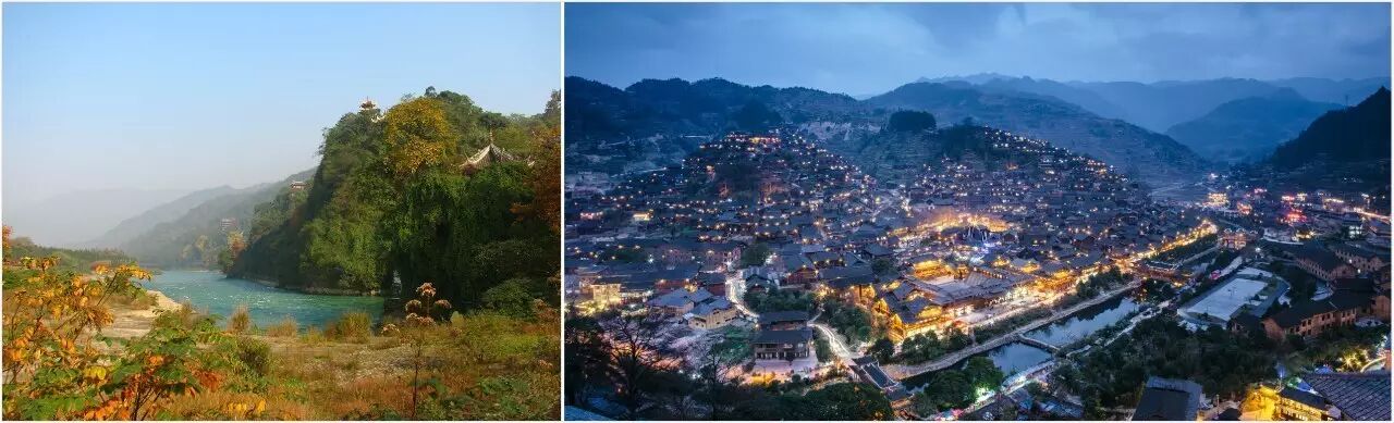 这两张图可能不是特别清晰,扫描君找来了图片,左边是青城山,右边是千户苗寨,都是绝美风光......