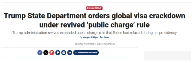 本周四(11月6日),多家美媒证实,美国国务院已通过电报正式下令全球使领馆,恢复并扩大对签证申请人实施的“公共负担”(Public Charge)审查制度,这一政策正是特朗普政府首任期内最具争议的移民收紧措施之一。