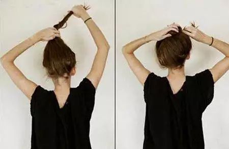 就手抓住发尾部分将发丝全部拉到头顶的位置。