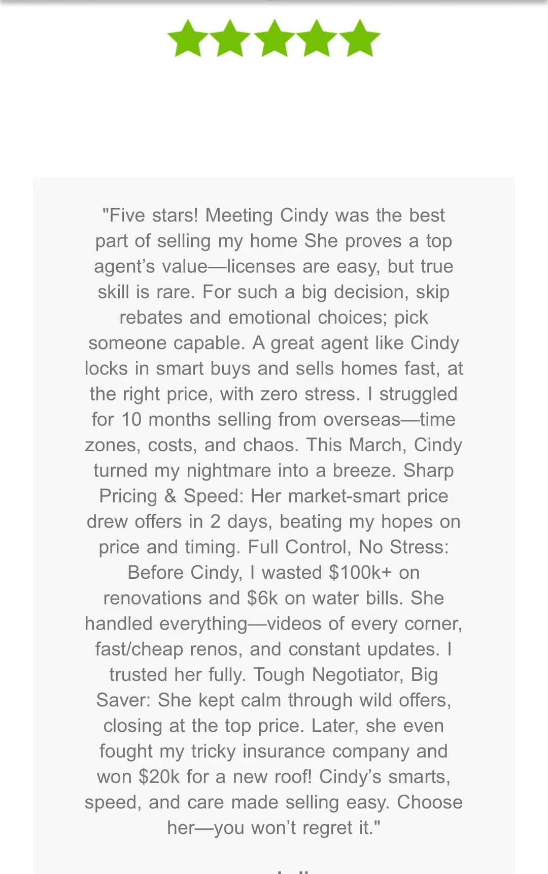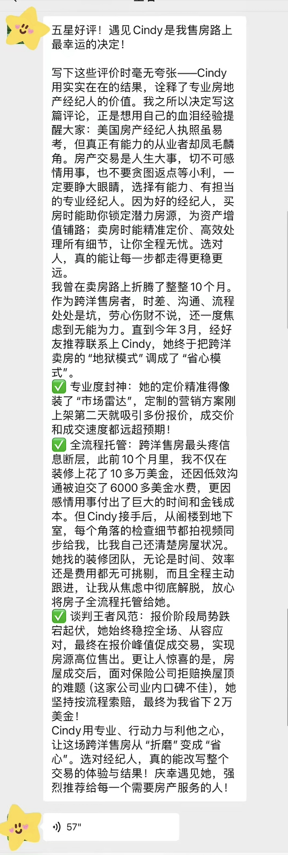 过户那天,业主激动地留下了一份中英文长评。她甚至比赵妍还焦急地叮嘱:“Cindy,你一定要多做广告!让那些真正需要专业帮助的人看到你,别再让不专业的人坑惨了。”