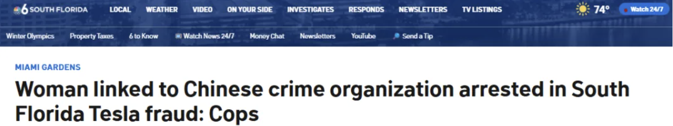 周一,一名华人女性在迈阿密花园市(Gardens)试图冒用他人身份购买特斯拉汽车时被抓获,之后她“承认自己参与了一个跨国运作的诈骗组织。
