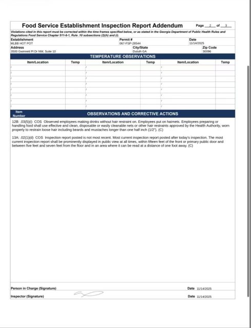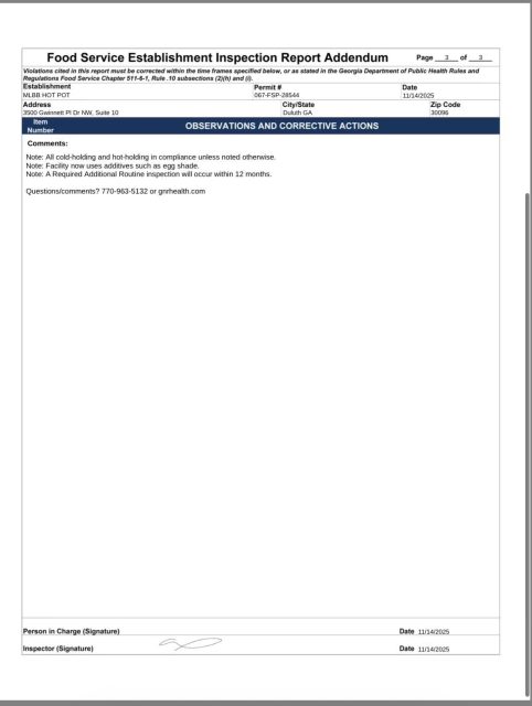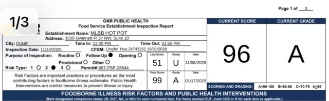 反正报告是公开的,大家可以自己上Gwinnett官网搜“MLBB Hot Pot”或者地址“3500 Gwinnett Pl Dr NW, Suite 10”,11月14日那份96分的报告就在最上面。