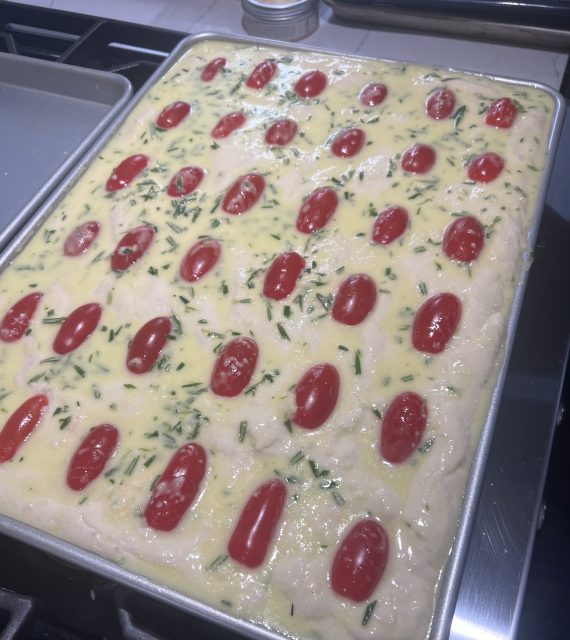 它有着橄榄油的香气与迷迭香的气息。我喜欢用坎帕尼亚的风干番茄与利古里亚的罗勒来搭配。鲜罗勒浓烈的香气和干西红柿浓缩的甜味是绝配的组合, 再配上佛卡夏柔软的口感,总感觉没有比这个组合更能说明意大利的南北结合了。
