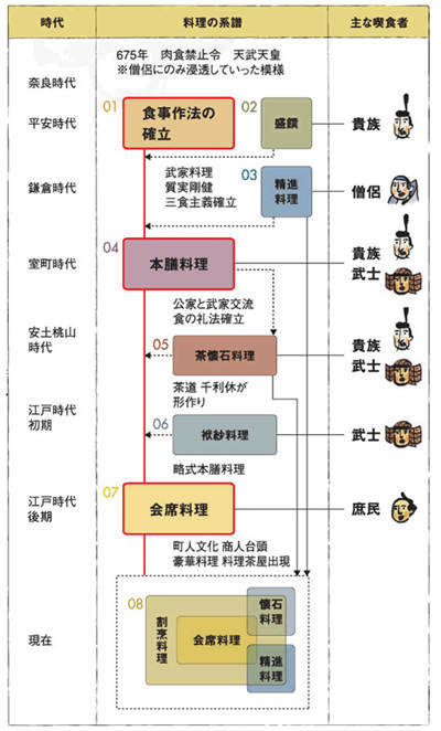 进入到江户时代(1603~1868)之后,餐饮文化开始发展,特别是宝历至天明时期(1751~1789),江户等大城市出现了一批高级餐馆,甚至期间出版了一些餐厅的评价指南。之后虽然沉寂了一段时间,但又在化政时期(1804~1829)达到了顶点。这一时期的餐馆推出了会席料理,将怀石料理中厨师总结出来的烹饪技艺继承下来,然后从茶道中剥离出来,形成了专门服务于餐饮的形式。当时有“会席”和“即席”两种,会席是提前预定或按餐馆定下的固定菜谱来吃,即席则是去了之后可以点单的。