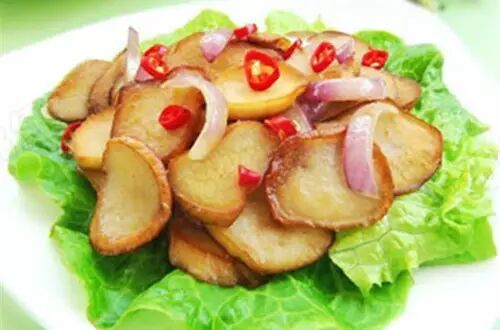 3.先放入土豆片翻炒一会,再放入杏鲍菇翻炒一会。