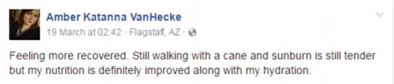 由于大峡谷气候干燥而且温度高,Amber慢慢出现了脱水和晒伤的状况。