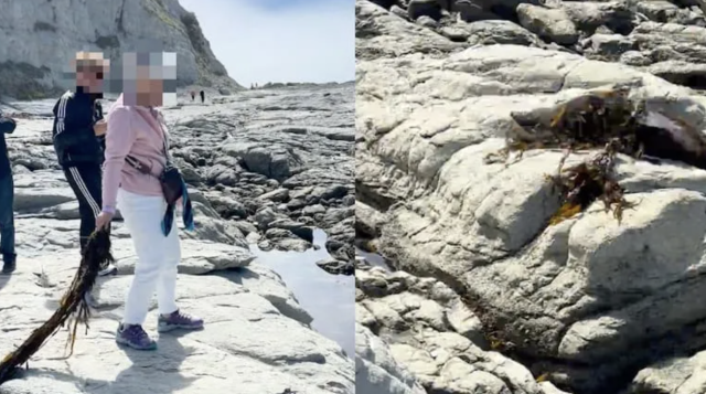 目击者 Bruno Chauca 用手机记录下了事发过程。视频中,一名年长女性游客拿着一团湿海带走向岸边,一旁还有一名年轻男子正在举着手机录像。